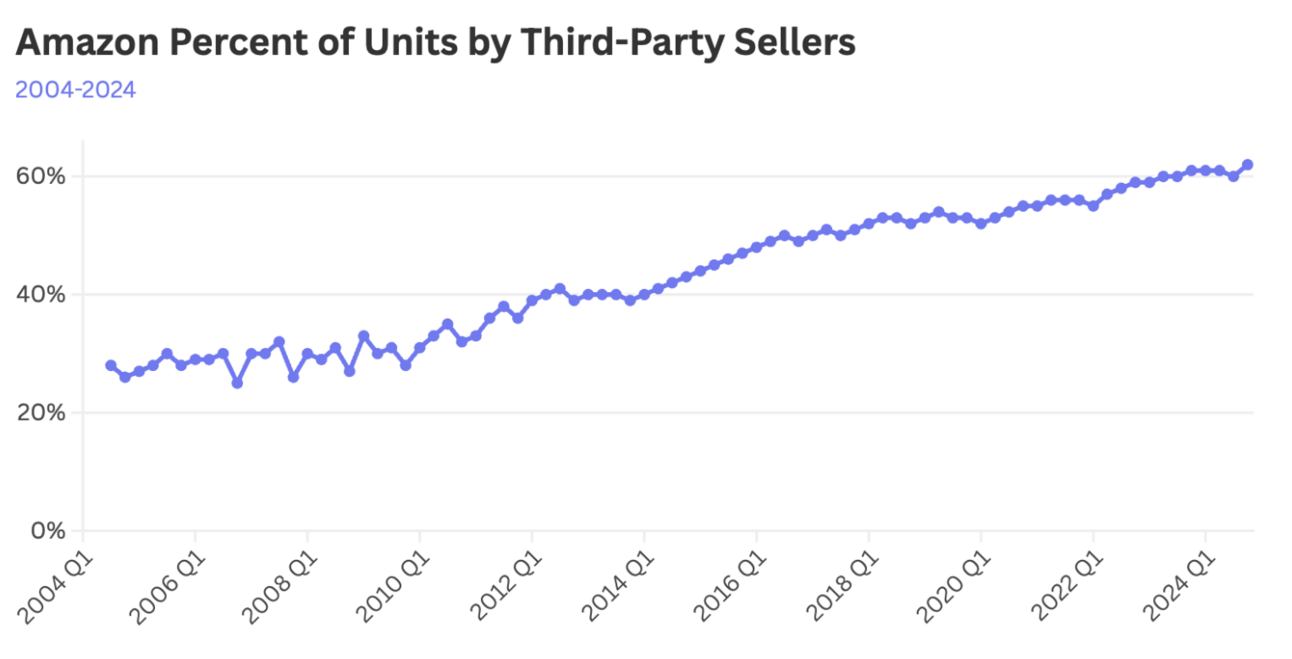 Amazon’s third-party sellers accounted for an all-time high of 62% of units sold in Q4 2024, though this is more by Amazon’s design than sellers’ dominance.