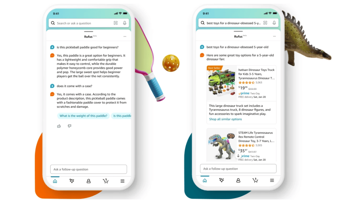 Find the best recommendations: Customers can ask for recommendations for exactly what they need, such as “what are good gifts for Valentine’s Day?” or “best dinosaur toys for a 5-year-old.” Rufus generates results tailored to the specific question and makes it quick and easy for customers to browse more refined results.